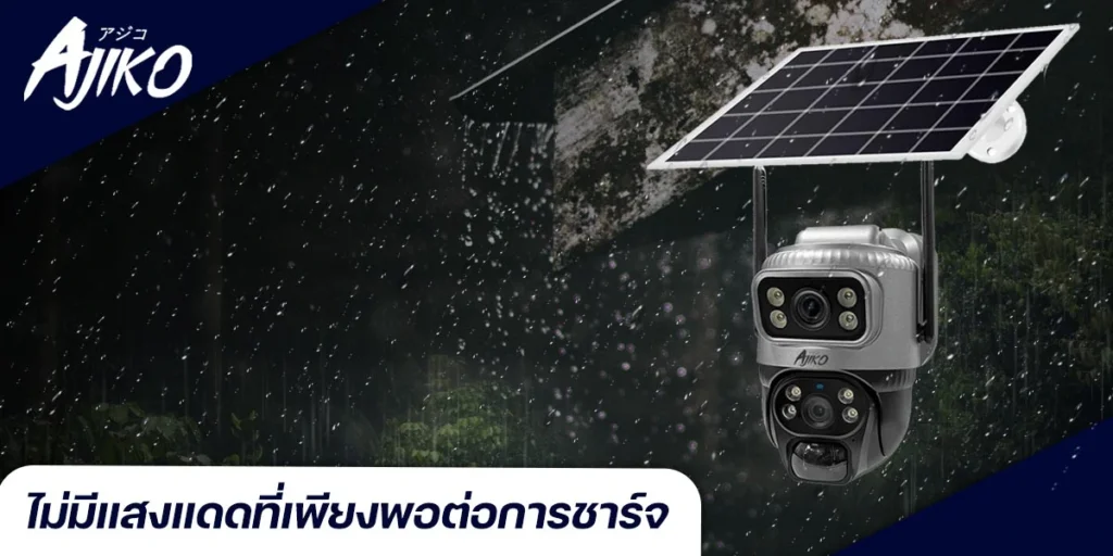 กล้องวงจรปิดโซล่าเซลล์อาศัยพลังงานจากการชาร์จแบตเตอรี่จากแผงโซล่าเซลล์ ซึ่งทำหน้าที่ในการผลิตกระแสไฟฟ้าเพื่อให้กล้องวงจรปิด Solar Cell ของเราทำงาน แต่เมื่อเกิดสภาพอากาศที่มีเมฆหนาทึบ ฝนตกหนัก หรือ พายุเข้า อาจไม่ค่อยมีแสงแดดที่เพียงพอต่อกันใช้ในการชาร์จแบตเตอรี่ซึ่งส่งผล ทำให้ปริมาณพลังงานที่ผลิตได้ลดลงอย่างมาก กล้องวงจรปิดโซล่าเซลล์ของเราอาจทำงานได้ไม่เต็มประสิทธิภาพ แบตเตอรี่หมดเร็วกว่าปกติได้